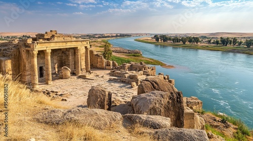A panoramic view of the ancient ruins of Assur, with the Tigris River flowing nearby