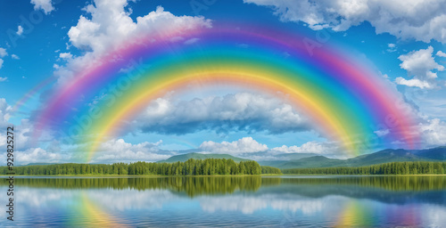 A panoramic view of the lake with a rainbow visible in the clear sky after the rain