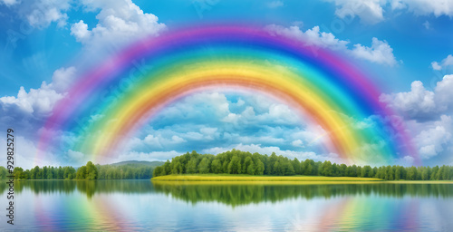 A panoramic view of the lake with a rainbow visible in the clear sky after the rain