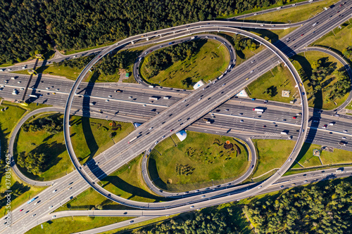 a panoramic view of the road with a complex system of interchanges with the city in the background filmed from a drone