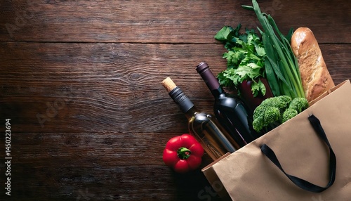 A paper bag filled with fresh produce and two bottles of wine on a dark wooden surface 34.jpg, A paper bag filled with fresh produce and two bottles of wine on a dark wooden surface