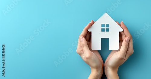 A paper cutout of a house is held in hands against a blue background, Generative Ai.