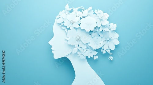 A paper cut-out of a woman's profile with a floral crown on a light blue background.