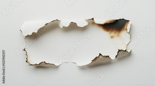 A paper with a burnt hole in the center, showcasing the singed edges and intricate texture of the burn, isolated on a clean white surface