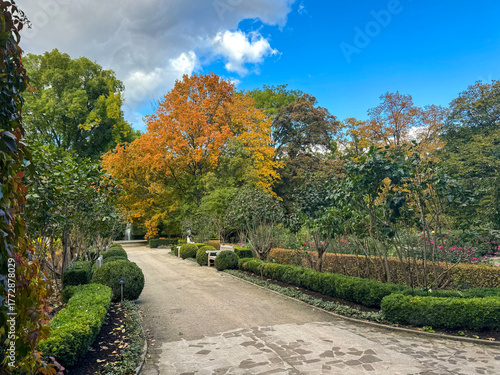 A park path winding through meticulously maintained greenery, framed by a brilliant blue sky with white clouds, highlighting a large tree in the center with orange and yellow autumn foliage.