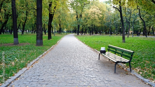 A park with a cobblestone path, a product resting beside it, timeless feel and text room on the upper right.