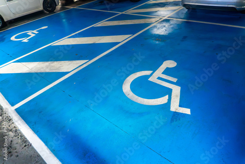 A parking lot with a blue handicap parking sign