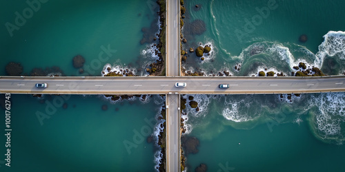 A passenger car drives over a connecting road over a bridge over water on the coast, coastal road by the sea