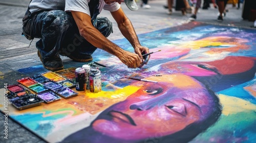 A passionate artist creates a colorful mural on the pavement amidst an energetic crowd, showcasing creativity