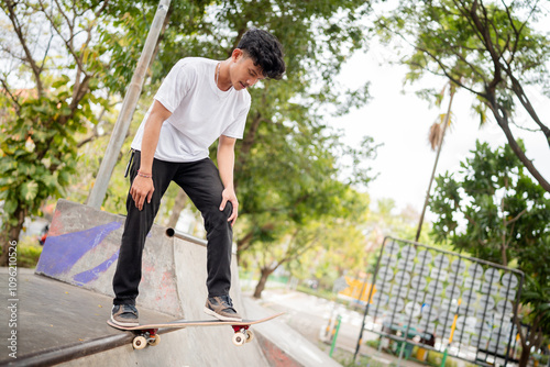 A passionate young skater is diligently mastering his cool tricks on a skateboard in the park