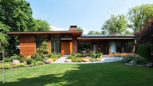 A passive suburban house featuring a photovoltaic system on the gable roof, with clean lines and a landscaped yard that highlights modern green living.