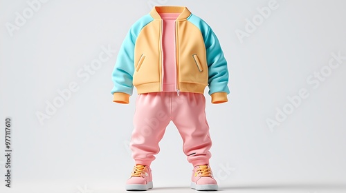 A pastel casual look featuring pink sweatpants and a yellow-and-blue bomber jacket, paired with sneakers.