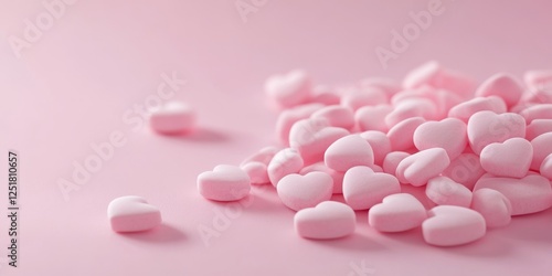 A pastel pink background featuring a scattered arrangement of soft heart-shaped candies with smooth textures and gentle shadows
