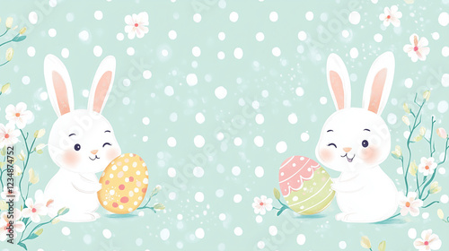 A pastel polka dot background with bunnies holding Easter eggs and surrounded by small blossoms. Easter, holidays