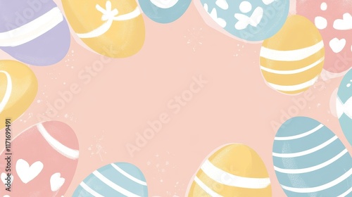 A pastel-themed illustration of decorative Easter eggs on a soft pink background.