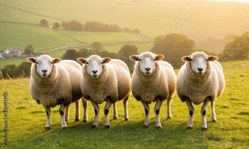 A Pastoral Scene, Four Sheep Grazing in a Lush Green Meadow on Sunny Day