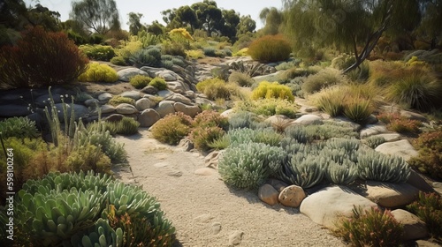 A patch of low growing, drought resistant plants embedded in sleepy, sloping bumpy land. AI generated