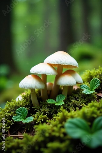 A patch of white mushrooms growing among ferns and moss, plants, forest