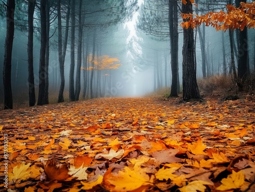 A Path Through a Foggy Forest Covered in Fall Leaves