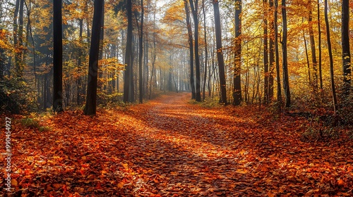 A path through a foggy forest with colorful autumn leaves on the ground.