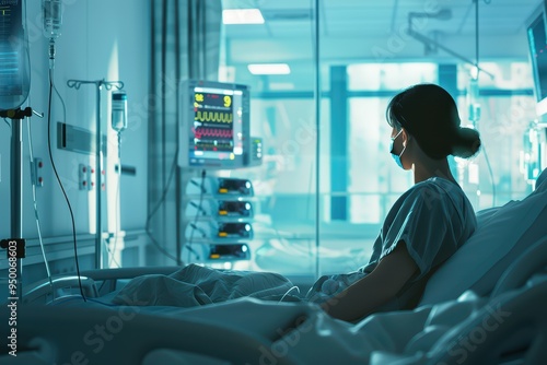 A patient sits quietly in a hospital room, observing medical equipment and monitoring systems, embodying hope and resilience.