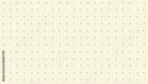 A pattern backgeound that features small flowers in square grid in pastel colors on cream linen fabric, Each grid contains one flower from various varieties