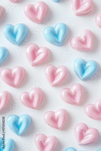 A pattern of pastel-colored, heart-shaped candies on a white background, with soft shadows. The candies are arranged in an artistic layout that suggests love or romance for Valentine's Day