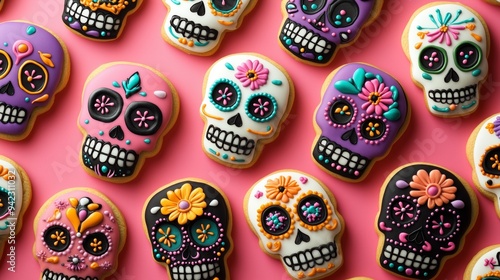 A pattern of sugar skull shaped cookies decorated with colorful icing and flowers, dia de los muertos theme on a pink background, top view