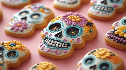 A pattern of sugar skull shaped cookies decorated with colorful icing and flowers, dia de los muertos theme on a pink background, top view