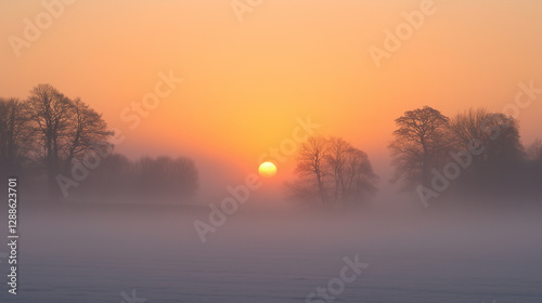 A peaceful and serene sunrise over a calm landscape. Perfect for themes related to tranquility, nature, and morning inspiration