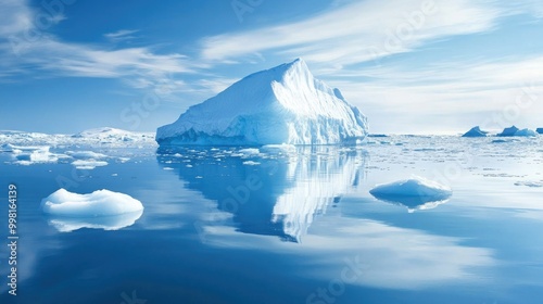 A peaceful Arctic scene of an iceberg surrounded by gently flowing water and ice floes.