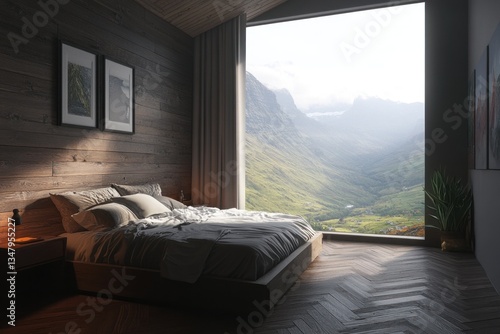 A peaceful bedroom with a large window and a beautiful view