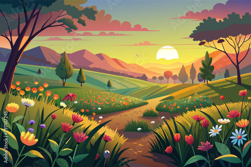 A peaceful countryside scene with rolling hills
