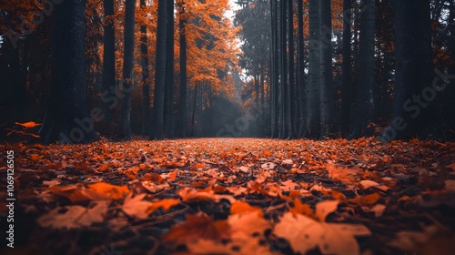 A peaceful forest clearing surrounded by tall trees adorned with autumn leaves