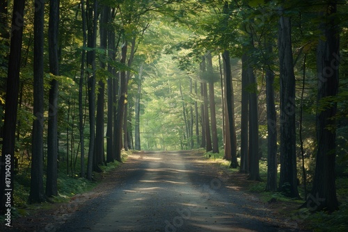 A peaceful forest path surrounded by tall trees, their leaves forming a stunning canopy above. The atmosphere is calm and inviting, perfect for a relaxing walk.