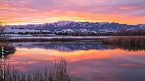 A peaceful lake reflecting the surrounding snow-covered mountains at sunrise.