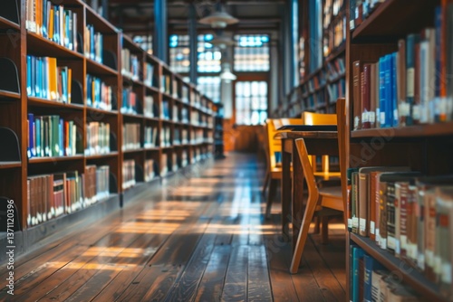 A peaceful library with rows of books and study desks, Quiet library with rows of books and study desks