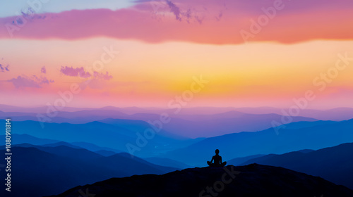 A peaceful scene of a person sitting cross-legged, meditating on a mountaintop at sunrise.