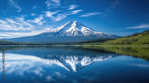 A peaceful scene of a snow-capped mountain reflected in a calm lake