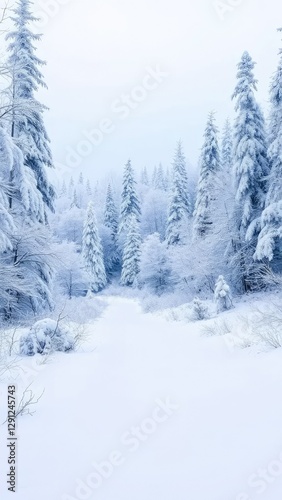 A peaceful snowy landscape with a frozen forest and snow-covered trees, frosty, natural wonder, serene