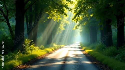 A peaceful sunlit road winds through a lush green forest, with sunlight streaming through tall trees and casting gentle shadows.
