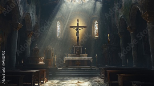 A peaceful, tranquil scene of a church with a crucifix of Jesus Christ displayed prominently