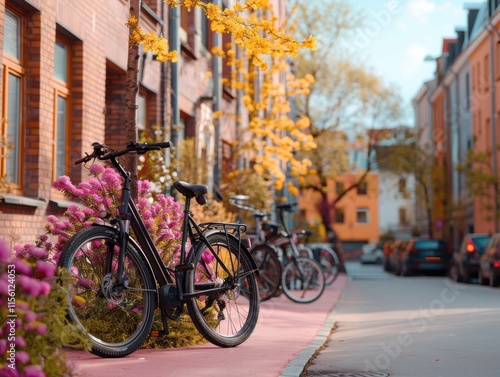 A peaceful urban street with charming brick buildings and bicycles lined up along a pink pathway, surrounded by vibrant flowers and trees.