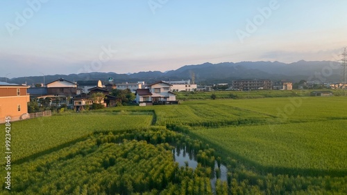 A peaceful view of rice fields and rural houses set against distant mountains under a clear sky.