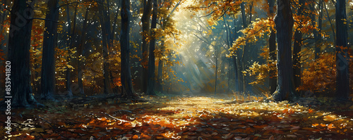 A peaceful woodland glade with sunlight filtering through the trees, illuminating a carpet of fallen leaves.