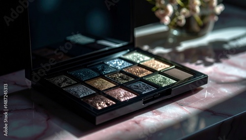 A pearlescent eyeshadow palette placed on marble