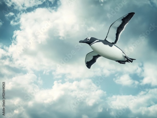 a penguin soaring through a cloudy sky