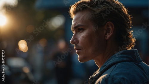 A pensive man stands in an urban setting at sunset, with soft golden light highlighting his features and creating a reflective mood.