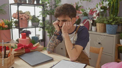 A pensive young hispanic man with tattoos rests in a flower shop surrounded by vibrant plants and bouquets.