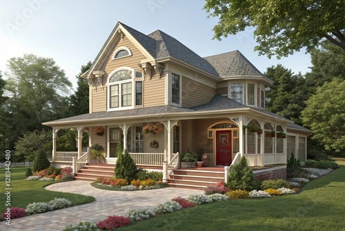 A perfect neighbourhood. Houses in suburb at Summer in the north America. Luxury houses with nice landscape